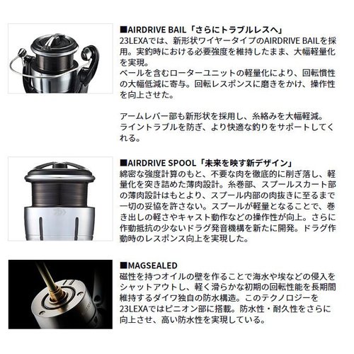 Катушка Daiwa 23 Lexa LT2500S оснащена инновационной технологией "Air Drive Design", которая представляет собой концепцию пневмопривода, способствующую улучшению баланса центра тяжести и снижению веса передней части катушки. Это, в свою очередь, повышает чувствительность системы нагрузки. Кроме того, катушка оснащена тормозной системой нового поколения "ATD TYPE-L", которая является усовершенствованной версией популярной системы ATD. Она гибко реагирует на внезапные изменения натяжения и снижает разрывы и обрывы лески. Катушка имеет прочный алюминиевый корпус.