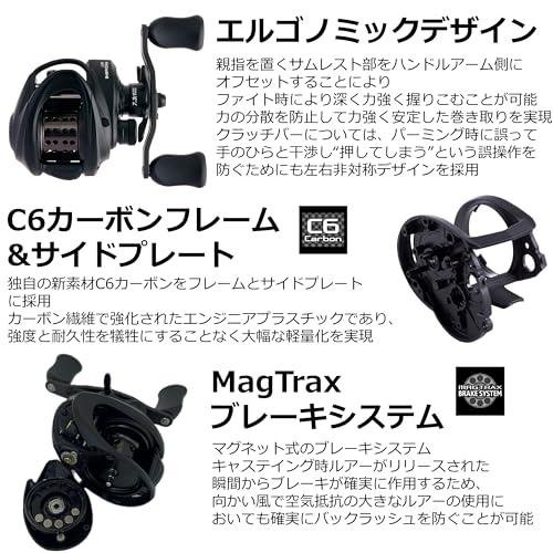 Катушка оснащена технологией MagTrax, которая обеспечивает плавную и стабильную работу тормозной системы. Главная передача выполнена из ультра-супер-дюралюминия, что обеспечивает легкость и прочность конструкции. Система передач Duragear гарантирует плавную и точную работу механизма. Карбоновая рама и боковая пластина из материала C6 обеспечивают легкость и прочность конструкции. Карбоновая рукоятка длиной 90 мм обеспечивает удобный захват и контроль над катушкой. Технология карбоновой матрицы используется для торможения с помощью кликера, что обеспечивает плавную и стабильную работу.