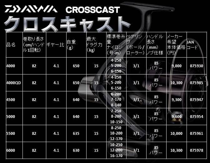Модель Daiwa 17 Crosscast 4000QD оснащена алюминиевой шпулей и снабжена быстрым фрикционом "Quick Drag", позволяющим быстро переключать шпулю с режима "свободной шпули" в режим блокировки. Кроме того, эта катушка содержит 3 шарикоподшипника плюс 1 роликовый подшипник, что обеспечивает плавный ход и минимальное трение. Технологии, применяемые в этой модели, включают "Digigear" для улучшения качества шестерни, "Infinite Anti-Reverse" для мгновенного тормоза обратного хода и "Twist Buster" для предотвращения закручивания лески.