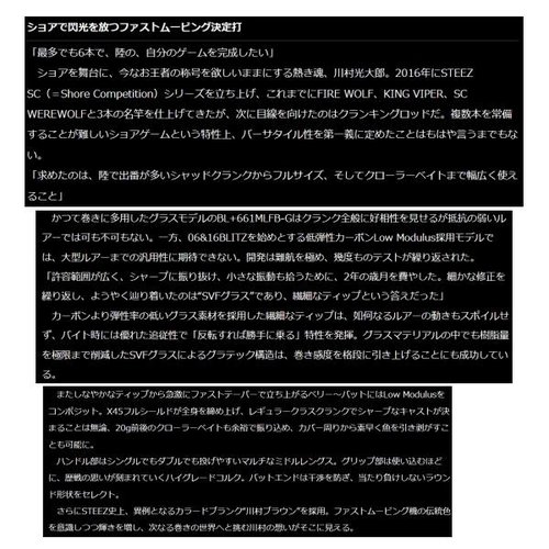 Daiwa 21 Steez SC C66ML-G Lighting - новинка 2021 года, представляющая собой усовершенствованный вариант классической серии STEEZ. Технология SVF Glass, используемая в этой модели, позволяет уменьшить количество смолы до уровня углеродной SVF, что приводит к образованию более плотных стекловолокон, обеспечивая при этом легкость, прочность и эластичность. Кроме того, Full Shield X45 полностью устраняет скручивание, возникающее во время динамических движений, таких как заброс, действие, подсечка и борьба.
