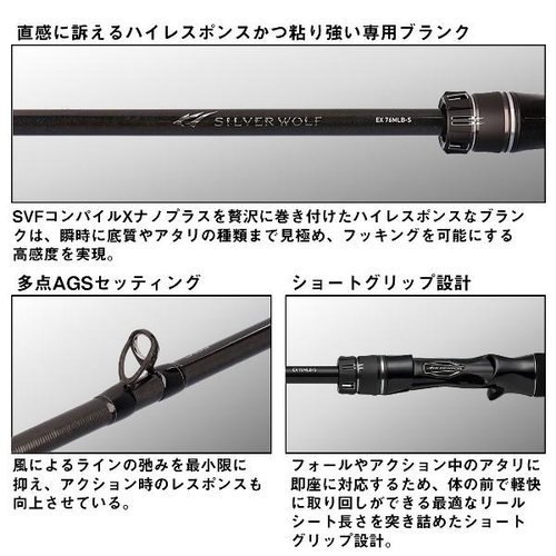 Этот спиннинг оснащен передовыми материалами и технологиями SVF Compilation X Nano Plus и X45X, которые поддерживают высокую чувствительность без потери мощности. Это позволяет рыболову мгновенно ощущать любые изменения в воде и действовать точно. Кроме того, Daiwa 24 Silver Wolf EX 76MLB-S оборудован AGS (Air Guide System), который размещает легкие и высокочувствительные кольца в нескольких точках, максимизируя мощность и прямое ощущение бланка, а также минимизируя провисание лески из-за ветра.