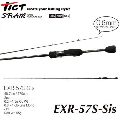 Удилище TICT SRAM EXR-57S-Sis оснащено ультратонким твердым карбоновым наконечником диаметром 0,6 мм, что позволяет осуществлять произвольное манипулирование легкими джиг-головками весом от 1 г или меньше. Данная модель предназначена для любителей легкой и сверхлегкой рыбалки.