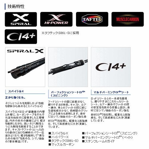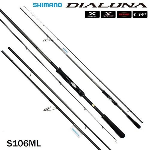 Shimano Dialuna S106ML создана с применением двух уникальных технологий: Spiral X, которая предполагает спиральную укладку волокон, и Hi-Power X, при которой волокна укладываются крестообразно под углом 45 градусов. Эти технологии позволяют уменьшить расход материала, снизить вес бланка, увеличить его прочность при нагрузках на изгиб и скручивание. Материал бланка обладает высокой звонкостью, что делает его подходящим для джиговой рыбалки.