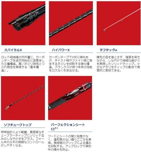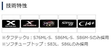 Бланки спиннинга изготовлены по технологии Spiral X и High Power X, что позволяет им быть более легкими и тонкими, сохраняя при этом высокую прочность и жесткость. Спиннинг имеет трубчатый наконечник Soft Tube Top. Катушкодержатель изготовлен из материала CI4+. Направляющие рамки из нержавеющей стали с кольцами SiC.