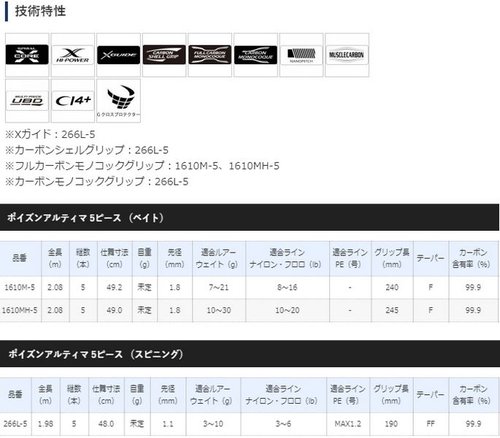 Shimano 20 Poison Ultima 266L-5A оснащен рядом инновационных технологий, включая Spiral X, которая обеспечивает улучшение прочности и чувствительности удилища. High Power X применена на первых двух секциях удилища, что увеличивает его прочность и устойчивость к нагрузкам. X Guide и X Guide Aero Titanium используются для уменьшения трения лески и обеспечения более гладкого хода. Углеродная рукоятка каркаса и карбоновая рукоятка монокока обеспечивают легкость и прочность конструкции. Nano pitch и Технология Nano Alloy® способствуют улучшению характеристик удилища. Материал «Treca M40X» обладает высокой эластичностью и прочностью. Muscle carbon и Multi-piece UBD (Ultimate Blanks Design) обеспечивают отличную производительность удилища. Конструкция длины шага создает тон и улучшает чувствительность. Perfection sheet XT и G cross protector повышают прочность и надежность удилища. Улучшенная видимость благодаря разным цветам направляющей TOP и направляющей TIP облегчает контроль над леской.