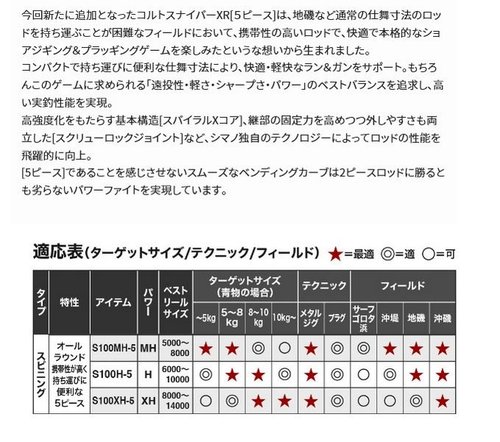 Спиннинг Shimano 22 COLTSNIPER XR MB S100XH-5 подходит для различных условий морской береговой ловли и может использоваться для ловли различных видов рыб с использованием металлических джигов и пилькеров весом от 30 до 100 г.