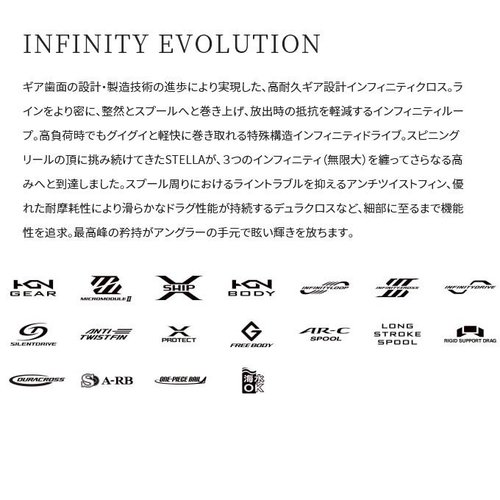 Главный вал катушки теперь опирается на шестерню, не контактируя с ней напрямую, а через специальную втулку, которая уменьшает сопротивление трения. Это значительно снижает сопротивление скольжению главного вала. Механизм "Infinity Cross" расширяет зону установки шестерни и распределяет нагрузку, что, по мнению SHIMANO, удвоило долговечность ведущей шестерни по сравнению с моделью 18 Stella. Сверхплотная обмотка "Infinity Loop" позволяет наматывать леску с очень мелким шагом.