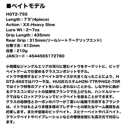Модель Custom GENOMA HGT2-75S из композитного стекла предназначена для ловли тайменя, скрывающегося в реках в небольших джунглях. Она оснащена малоэластичным бланком из гибкого стеклокомпозита, который позволяет контролировать крупные приманки строем удилища, а не рывками. Это удилище, сочетающее в себе малоэластичность стекла и мощность карбона в идеальном балансе, обещает открыть новые возможности для ловли не только тайменя, но и самых разных хищников.